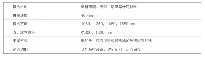 干式復(fù)合機主要結(jié)構(gòu)特點 收放卷:獨立塔式雙工位收放料架氣脹軸加安全夾頭裝卸料卷,換卷自動裁切放卷EPC裝置; 涂膠:直接凹版式涂布,氣動刮刀; 烘箱:三段頂開.............