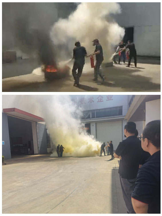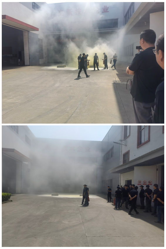 隨著一股濃煙升起、警鈴拉響,大家按照指定路線彎著腰、胳膊肘內(nèi)側(cè)捂住口鼻迅速有序地進行疏散撤離,在一分半鐘內(nèi)到達指定的安全區(qū)域。大家輪流使用干粉、干冰滅火器進行實際火源滅火操作,通過實踐,讓大家熟練掌握了滅火器的使用方法和要領(lǐng)。